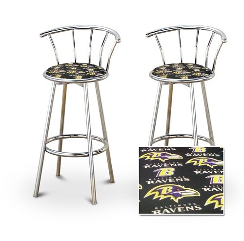 These are new, 29" chrome bar stools with footrests and swivel seats with a backrest! These FeatureBaltimore Ravens NFL Football themed fabric seats that are cool and unique. The pads are 14" across and the seat is 29" tall. The entire height is 39". The sides of the seat have nice metal work and there are feet protectors on the bottom of each leg. This is for two 29" stools..../ 2 Baltimore Ravens NFL Football Themed Specialty / Custom Chrome Barstools with Backrest Set / Dining Room Pub