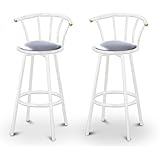 These are new, 29" White bar stools with footrests and swivel seats with a backrest! These Feature Glitter Silver Vinyl seats that are cool and unique. The pads are 14" across and the seat is 29" tall. The entire height is 39". The sides of the seat have nice metal work and there are feet protectors on the bottom of each leg. This is for two 29" stools.